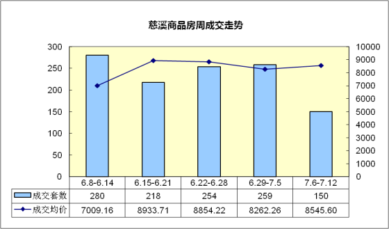 上周(7.6-7.12)慈溪楼市成交回落明显,各类房源(含住宅、公寓、商铺、写字楼和车库)共计成交150套,成交均价8545.60元/㎡,成交面积14769方。环比上上周成交量下跌42.08%,成交均价上涨3.43%,成交面积下跌38.28%。