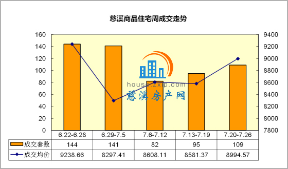 在宁波刚出台的购房补贴新政的推动下,上周慈溪楼市量价齐涨,新房成交量大增,楼市继续回暖。据统计,上周(7.20-7.26)成交各类房源(含住宅、公寓、商铺、写字楼和车库)共计成交206套,成交均价8844.34元/㎡,成交面积20739方。环比上上周成交量上涨36.42%,成交均价上涨2.93%,成交面积上涨26.26%。